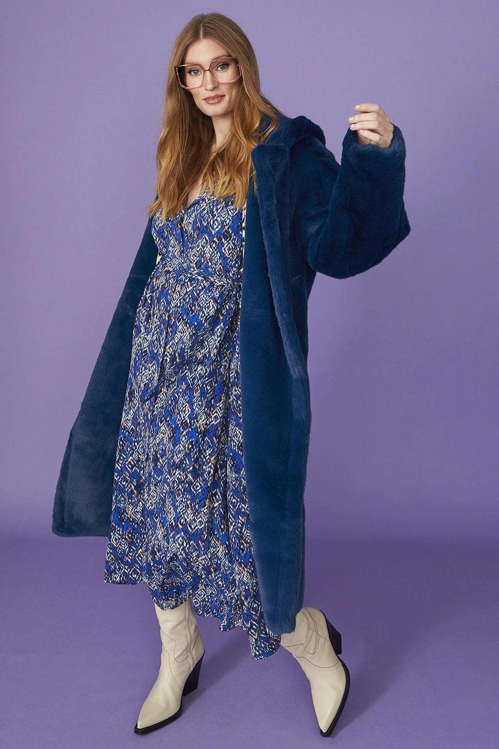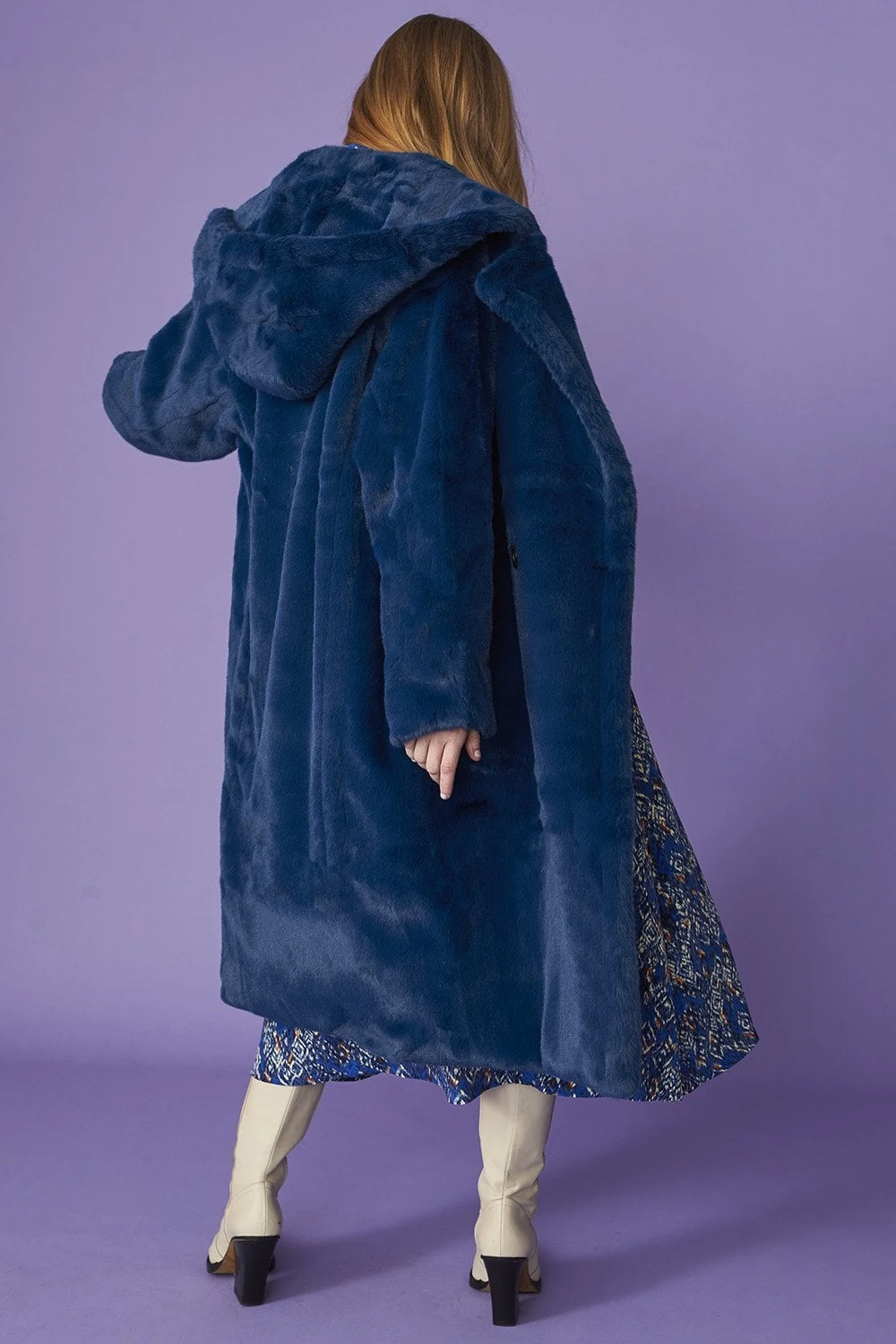 Snuggle up in our luxurious faux fur midi coat in a bold blue with an oversized hood. This coat features full lining, pockets and an incredibly warm finish