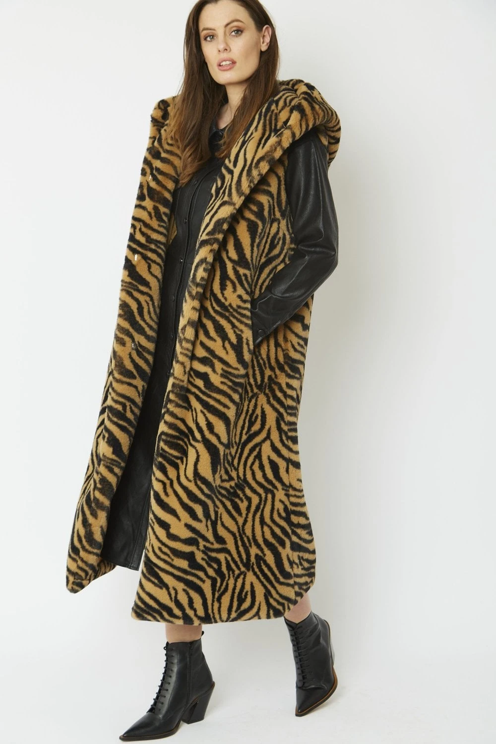 Made to make a bold statement that stands out from the fashion pack, this faux fur all-over animal print, double-breasted gilet is fun and fierce. We love the full-length longline look, adding a unique spin on the most-loved texture trend. Featuring a snuggly hood and deep pockets, this gilet is one we’re sure you’ll love.