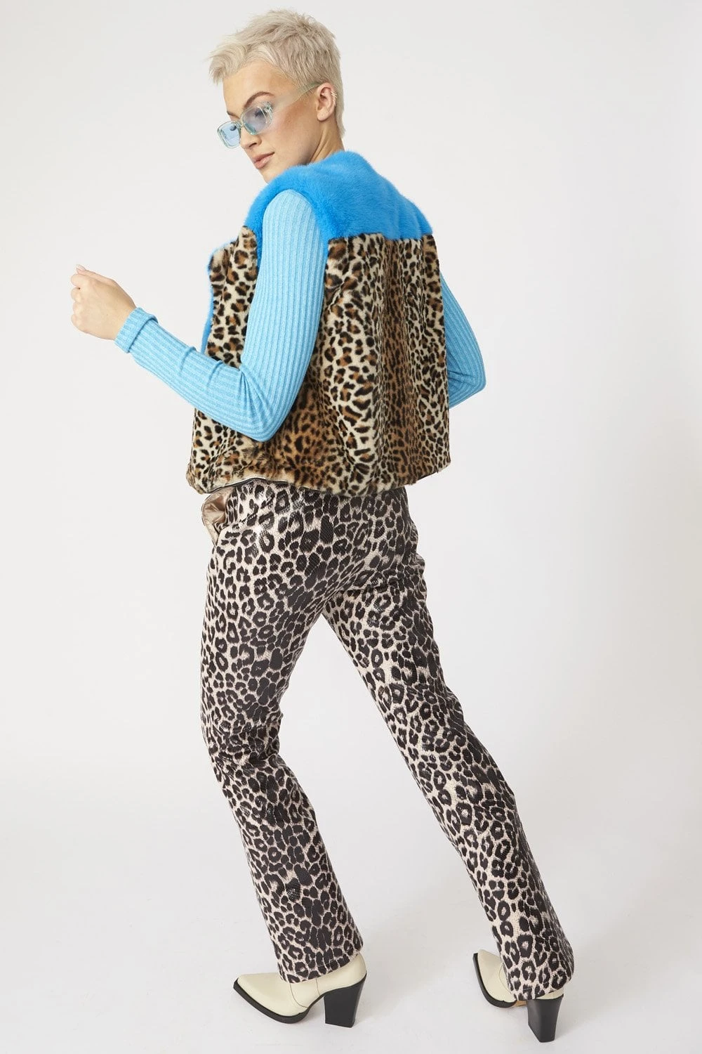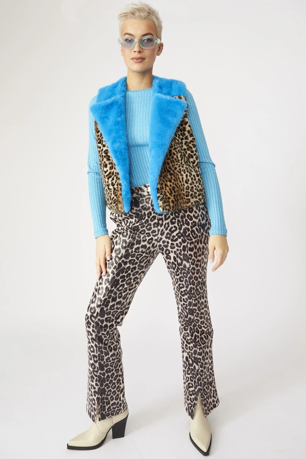 A real wow factor gilet, gorgeous hues meet bold blues. This gilet has classic lapels, really plush faux fur and a zip along the mid section allowing you to wear it shorter or longer depending on your outfit.