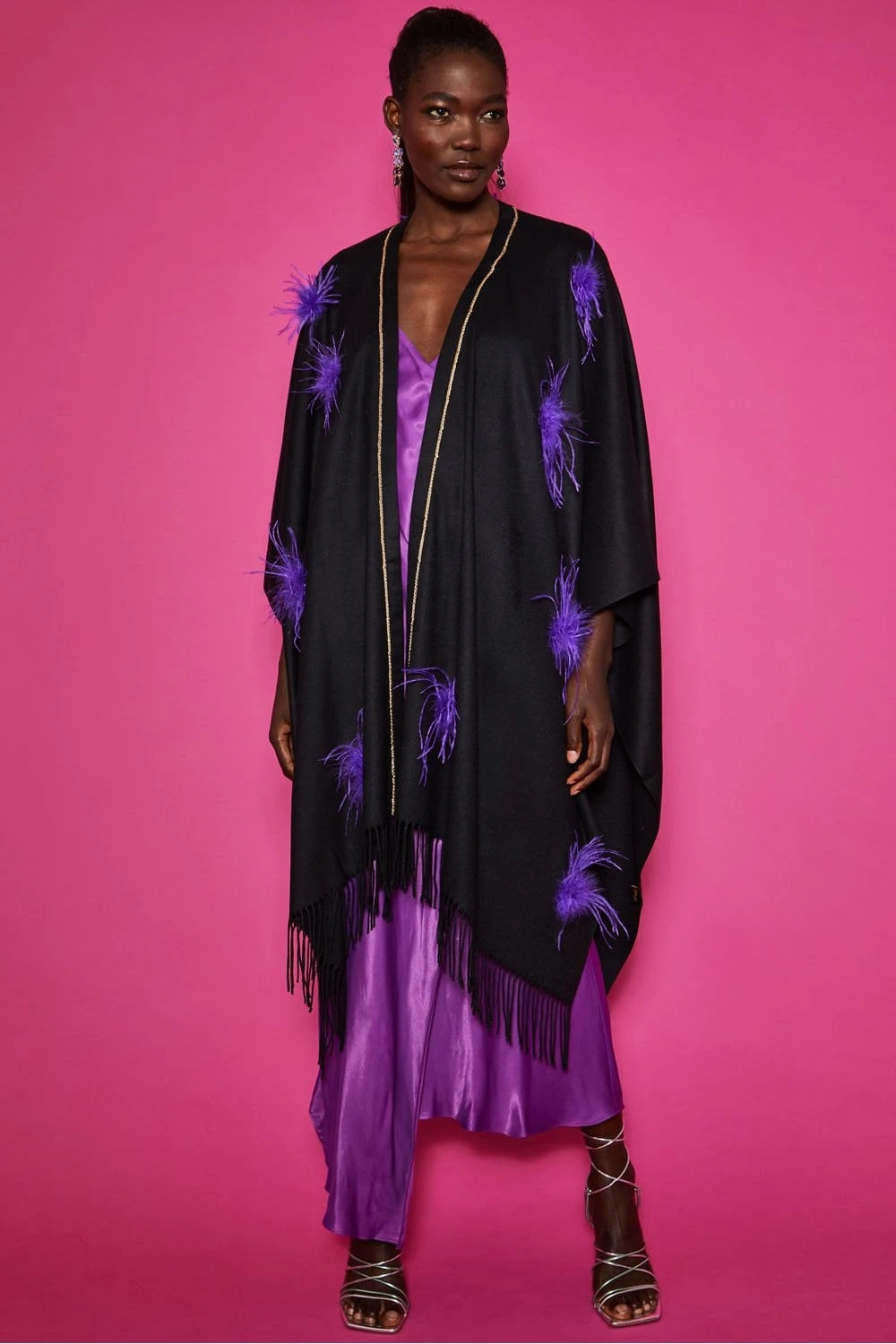 Envelop yourself in luxury with our black cashmere blend wrap featuring statement purple feather embellishments, gold chain trim and tasselled edging, it is the perfect addition to any outfit.