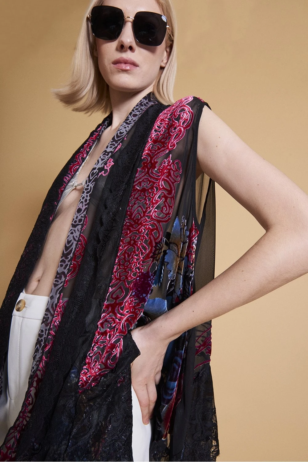 Jayley Luxury Devore Sleeveless Open Front Kaftan with Lace Details