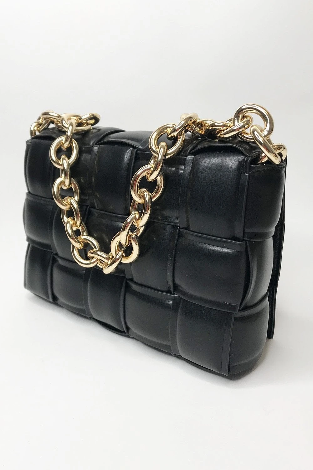 Add a touch of edge to your look with this gorgeous cross over bag with gold chain. Featuring full lining and small internal zip pocket.