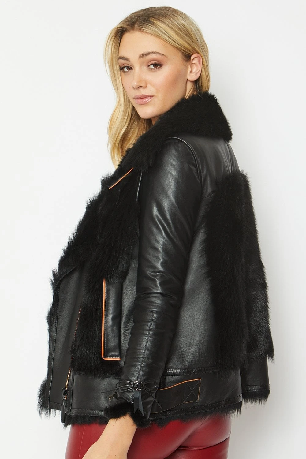 Gorgeous and sophisticated. Shop this shearling and leather aviator style jacket with contrasting neon orange zip and stitch detailing. Featuring pockets, full lining, and full-body zip detailing, we know that this jacket is something you’ll cherish for a lifetime.