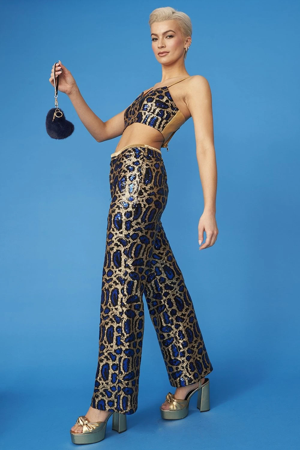 Animal print embellished bralet featuring sequin embroidery, leather and silk lining, zip back fastening. To achieve the full look pair with its matching flares and blazer!
