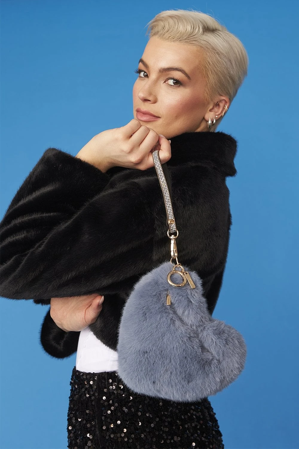 How cute are these faux fur Heart Bags! They are perfect for adding a touch of colour and fun to your look. Featuring a zipper, full lining and a removable diamante wrist strap. Available in a variety of colours.