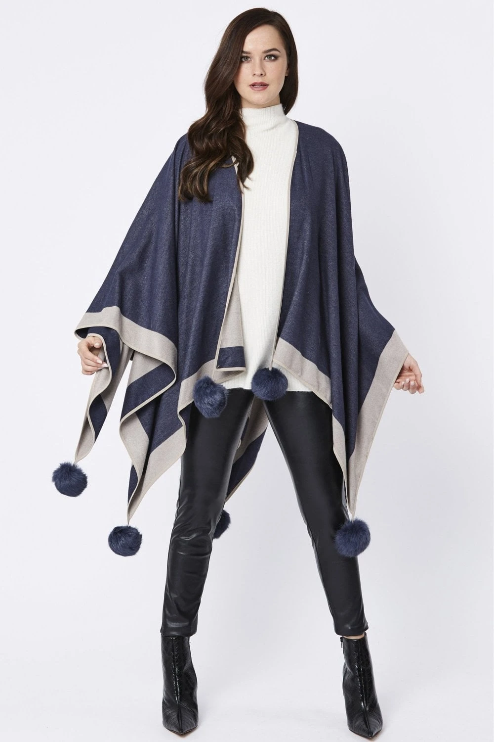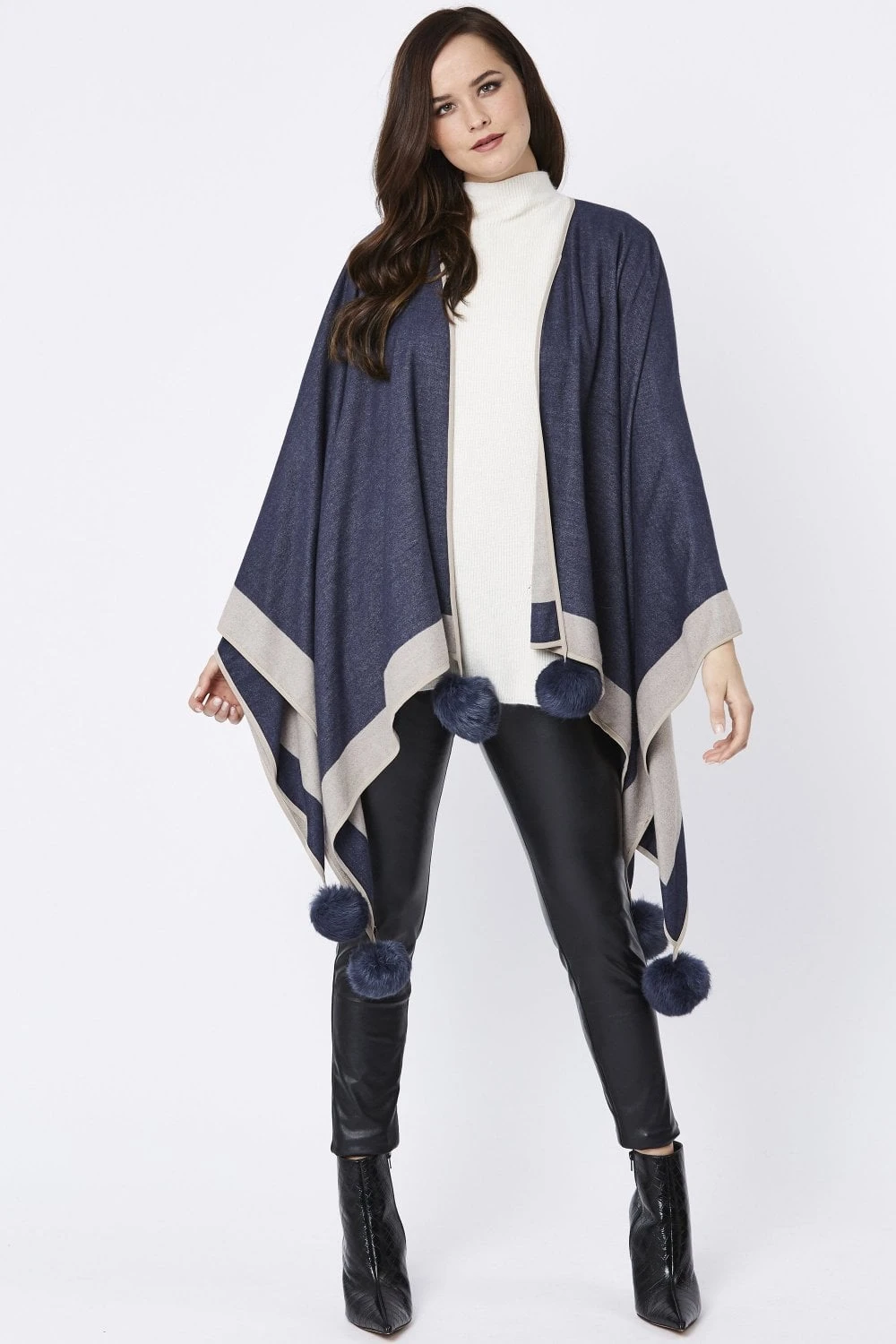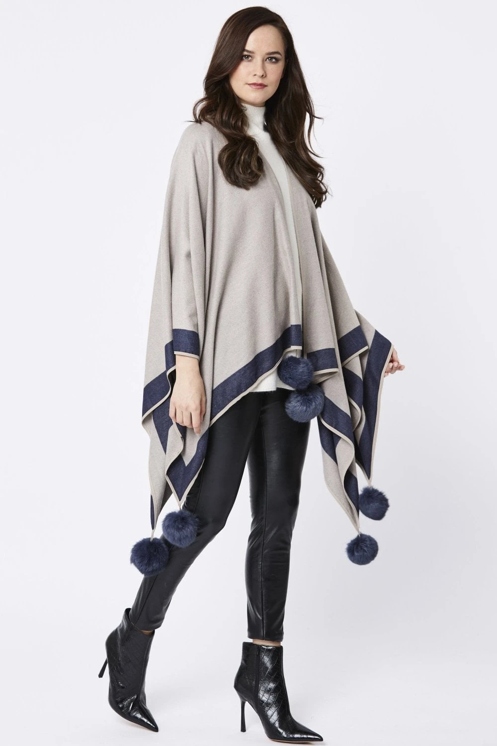 Luxury cashmere blend pom pom wrap with statement matching pom poms, perfect to wrap around any outfit in the winter.
