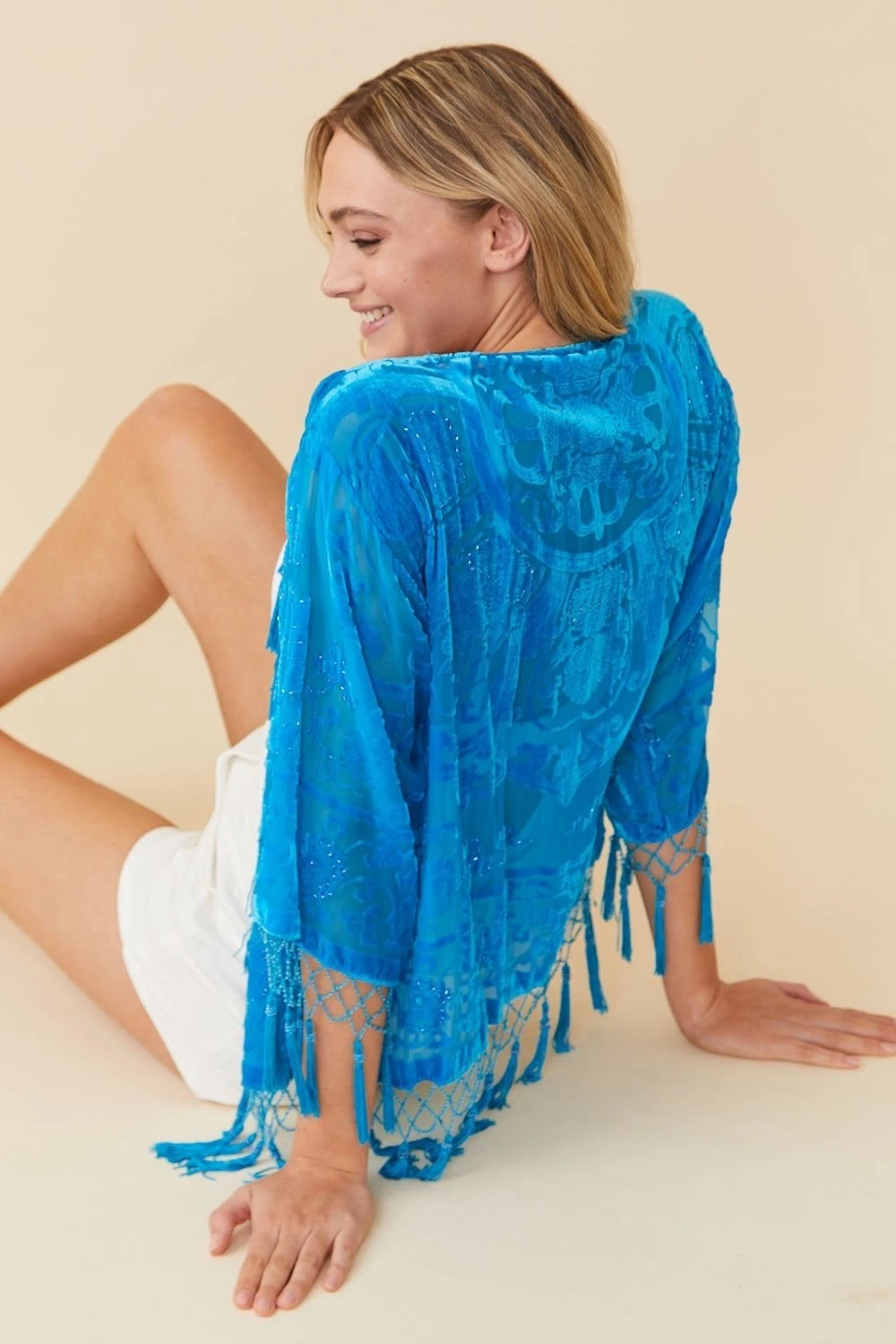 Stylish and versatile vintage inspired devore jacket, finished with a tasselled hemline and an intricate eastern inspired pattern.