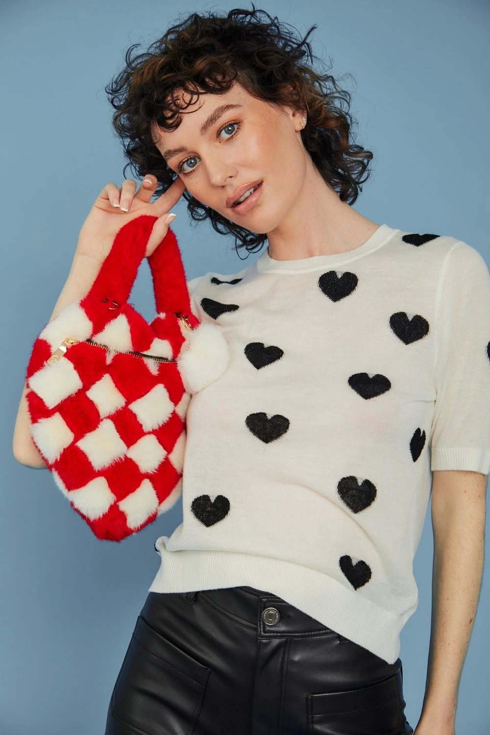 Our handmade black and white diamond faux fur bag is a must for the coming season. The heart shape and added pom-pom brings a sense of fun whilst being large enough to hold all your essential items.