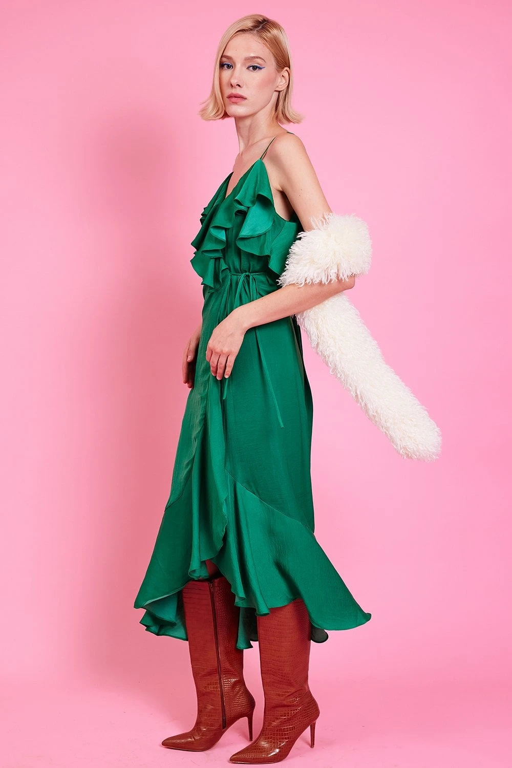 JAYLEY Emerald Silk Blend Maxi Ruffle Wrap Dress