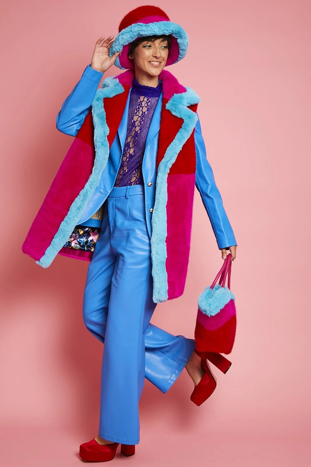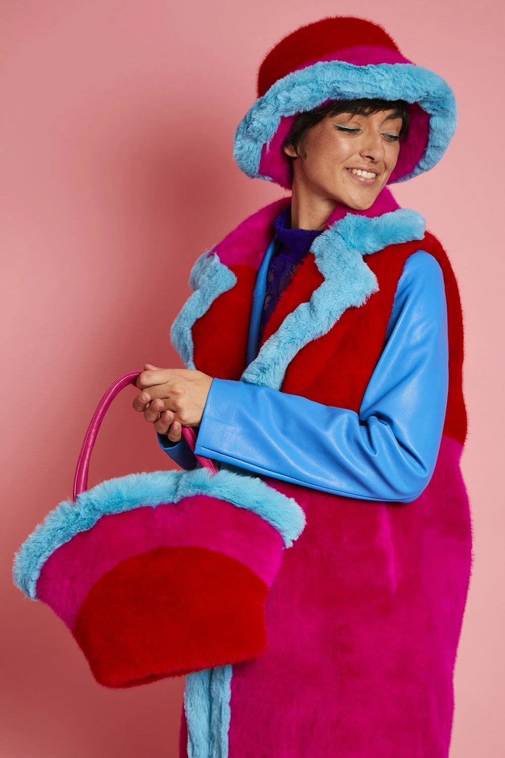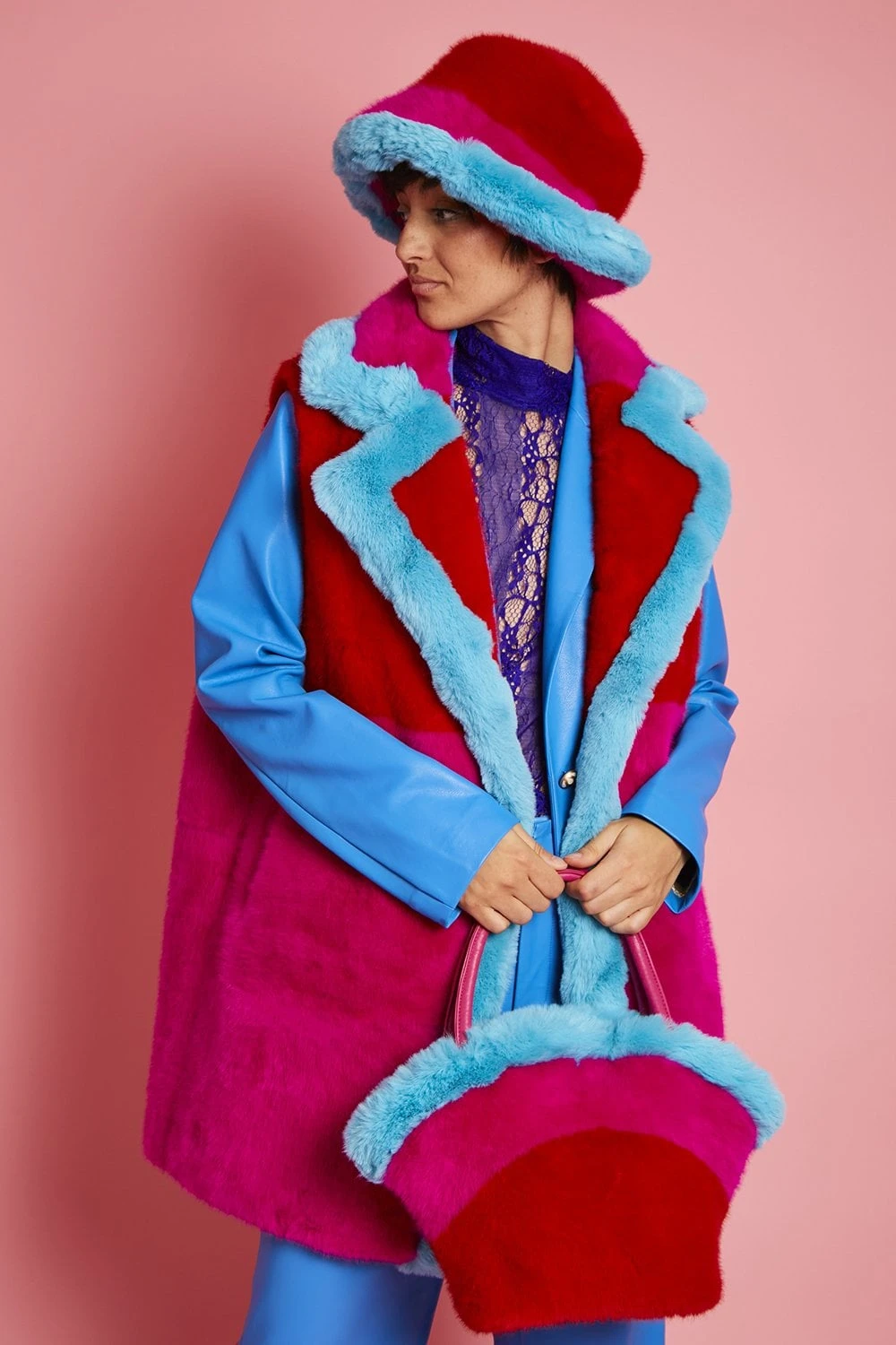 Add a touch of vibrant colour to your look with this gorgeous faux fur gilet with a classic collar. In a patchwork style, this gilet features 3 bold tones including an electric blue to brighten the front outline of the design. This coat has button front fastening and pockets.