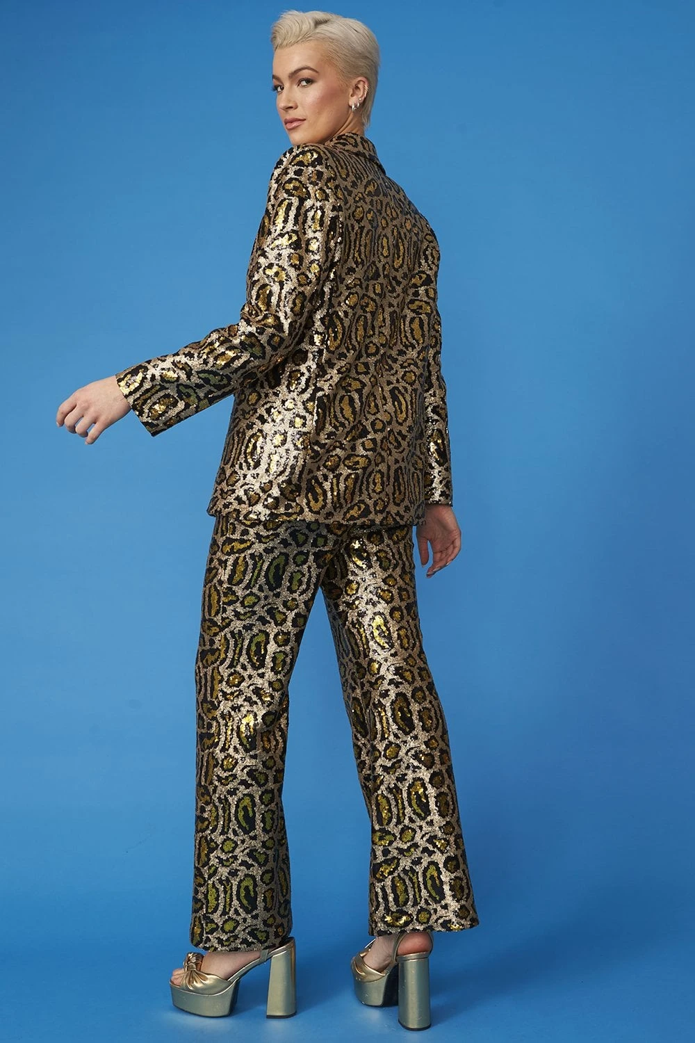 Gold animal print embellished flared trousers featuring sequin embroidery, a high elasticated waist, silk lining, and pockets. To achive the full look pair with it’s matching bralette and blazer!