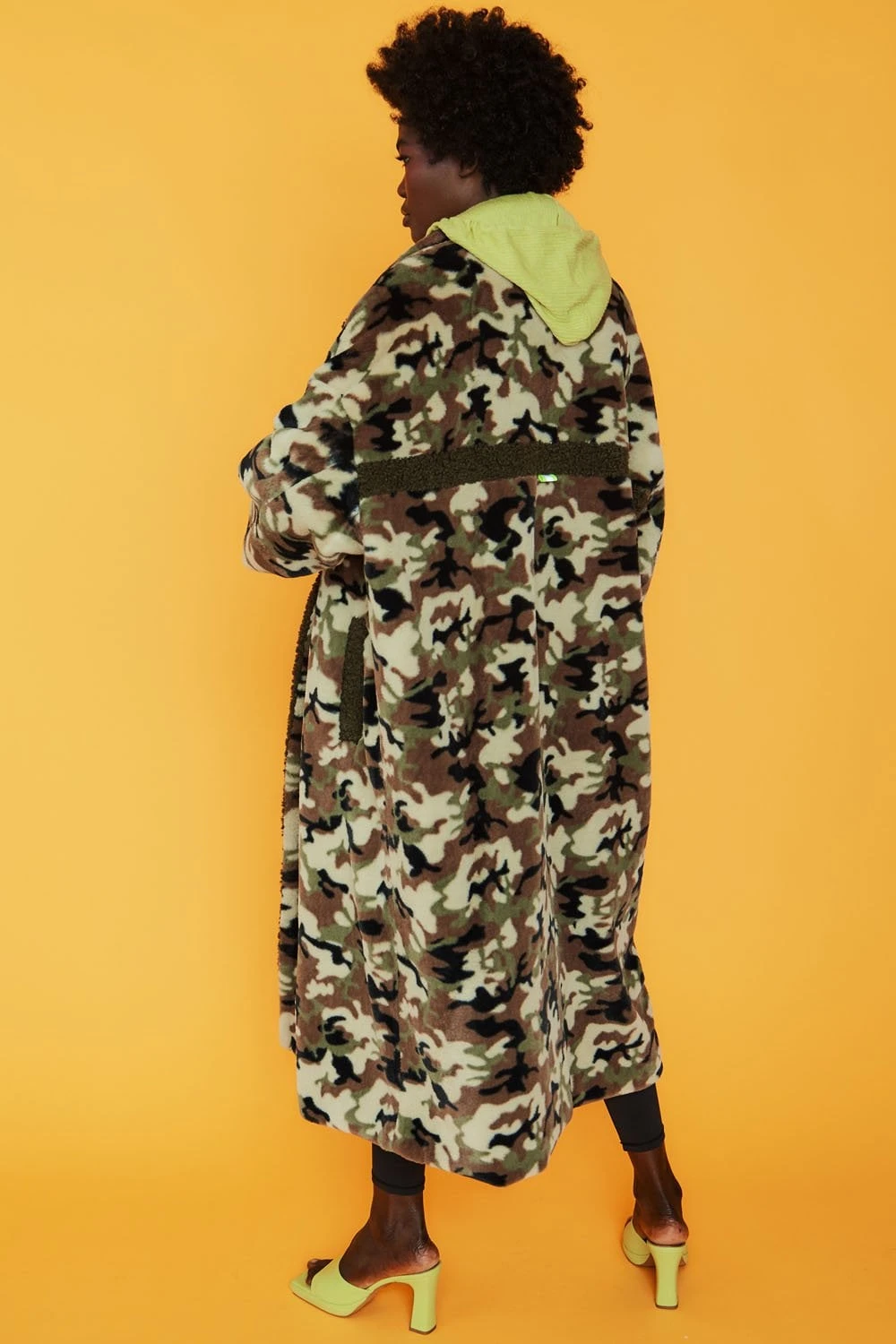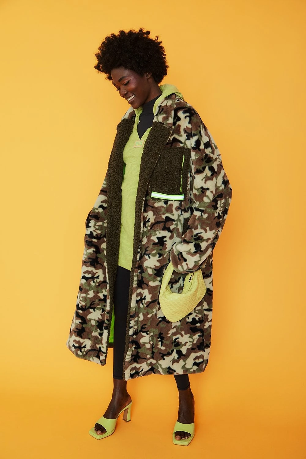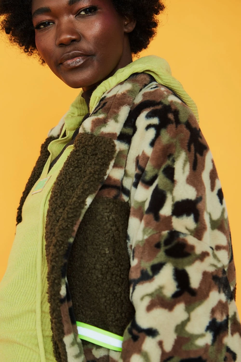 Complete your workout wardrobe by adding this beautifully bold faux fur camo jacket. Featuring a shearling teddy bear collar and pocket finishes and a contrasting neon lining, reflective bands, with a classic style collar and pockets.