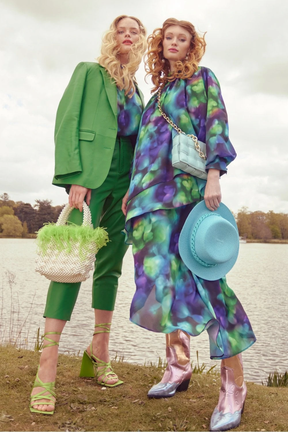The stunning bag features two beaded top handles, a delicate lining with hand-drawn doodles, and an inside pocket.