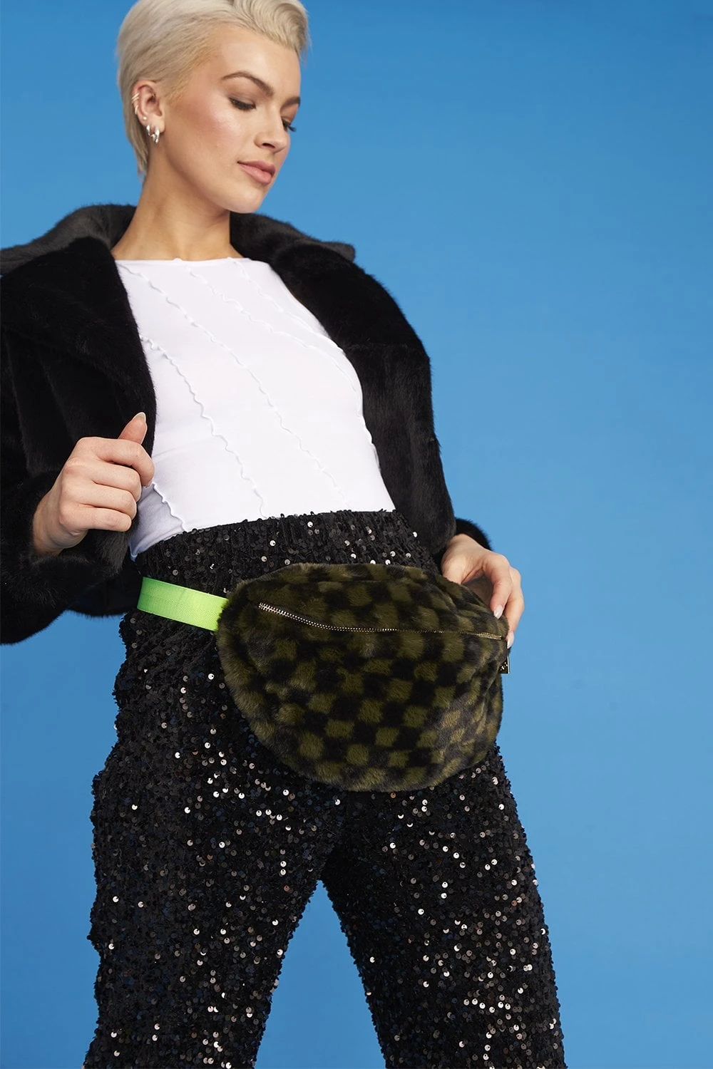 Add a fun and fluffy feel to your festival essentials with this faux fur bum bag. Wear over your shoulder or in a classical waist-belted position. The bag has full lining and zip interior pocket with zip closure to keep all your belongings safe.