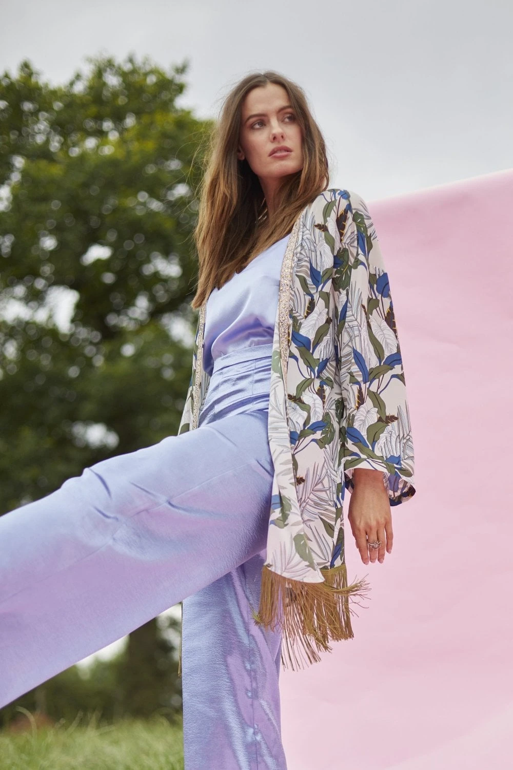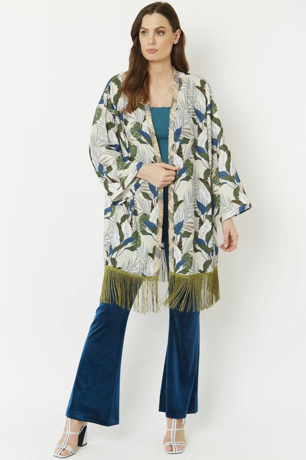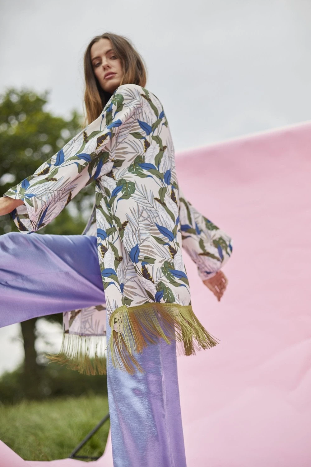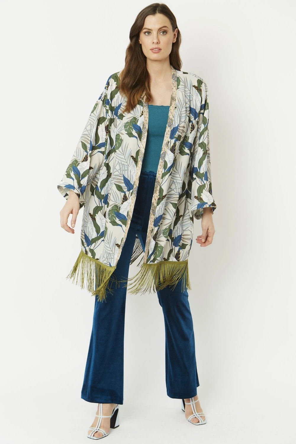 Showcasing a tropical botanic print this silk blend, kimono with beaded collar and tassel fringe is a loose and floaty, oversized fit garment that brings a hyper-feminine charm to every warm-weather look.