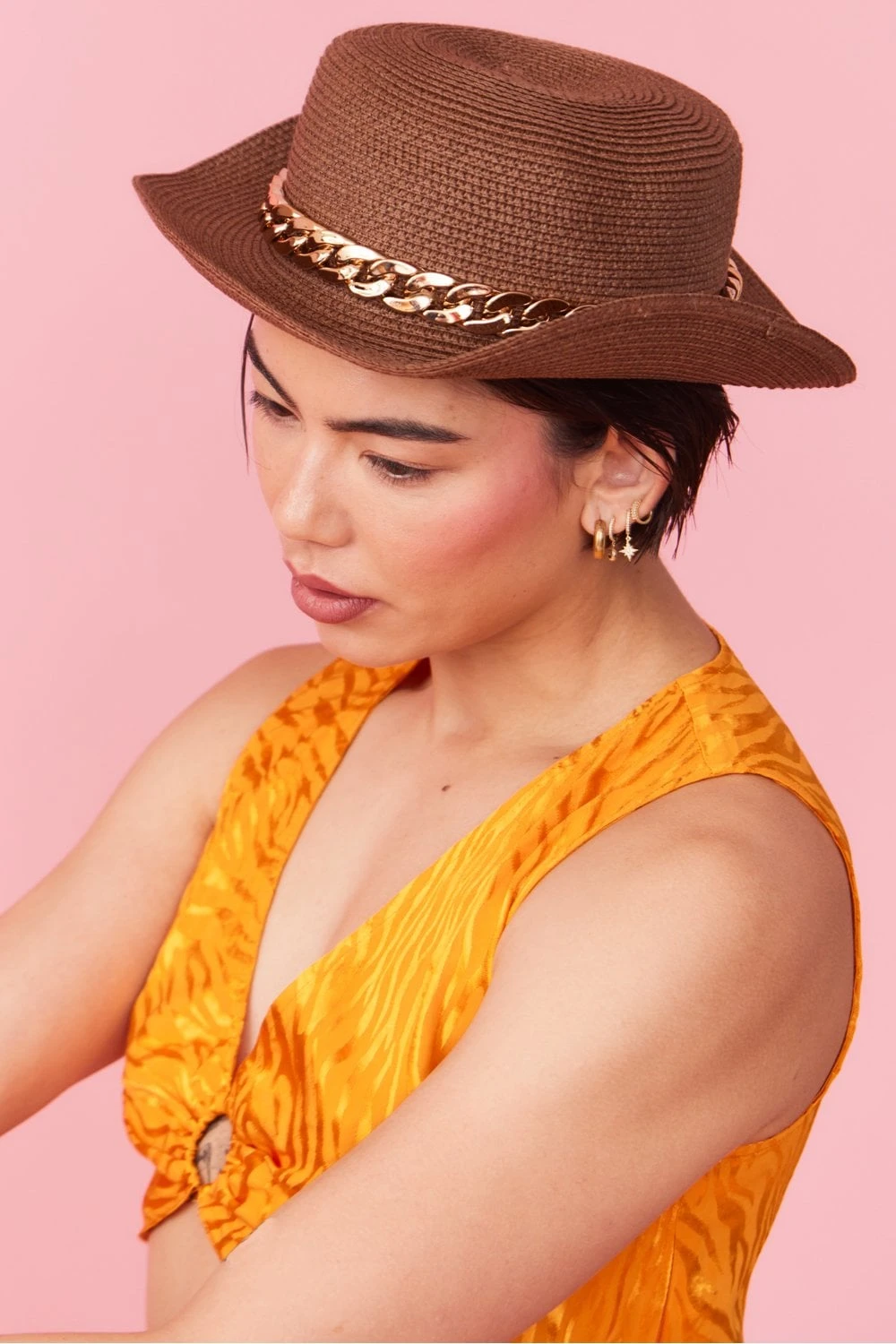 Top off any look with this Black bamboo hat with chain detailing. We love a chic hat vibe, especially on those bad hair days. The chain detail adds the extra sass that we love to see. Perfect for all occasions!
