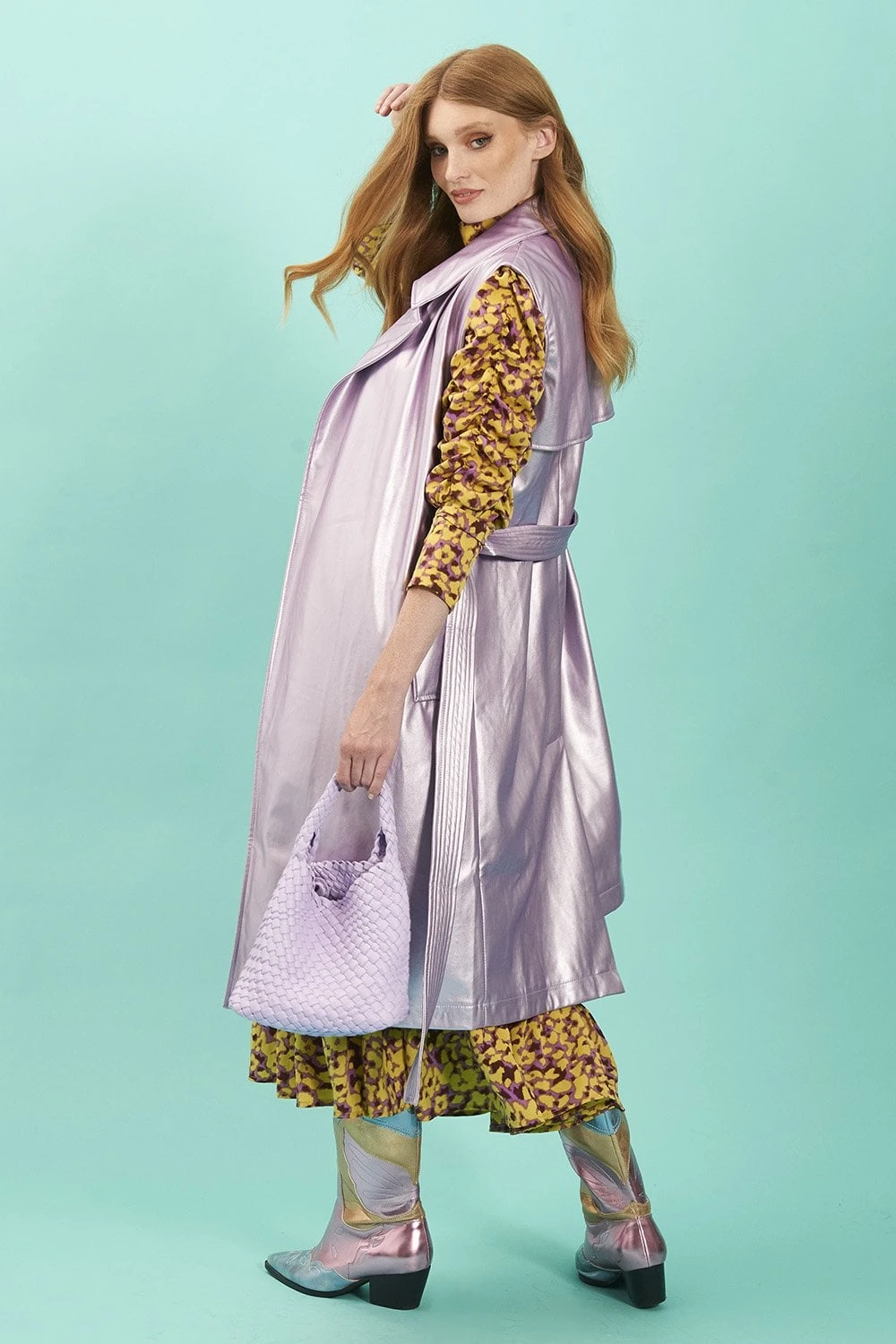 Metallics are a staple piece this AW and this lilac trench gilet has donned the catwalk at all angles. Featuring classic lapels and a belted waist with pockets.