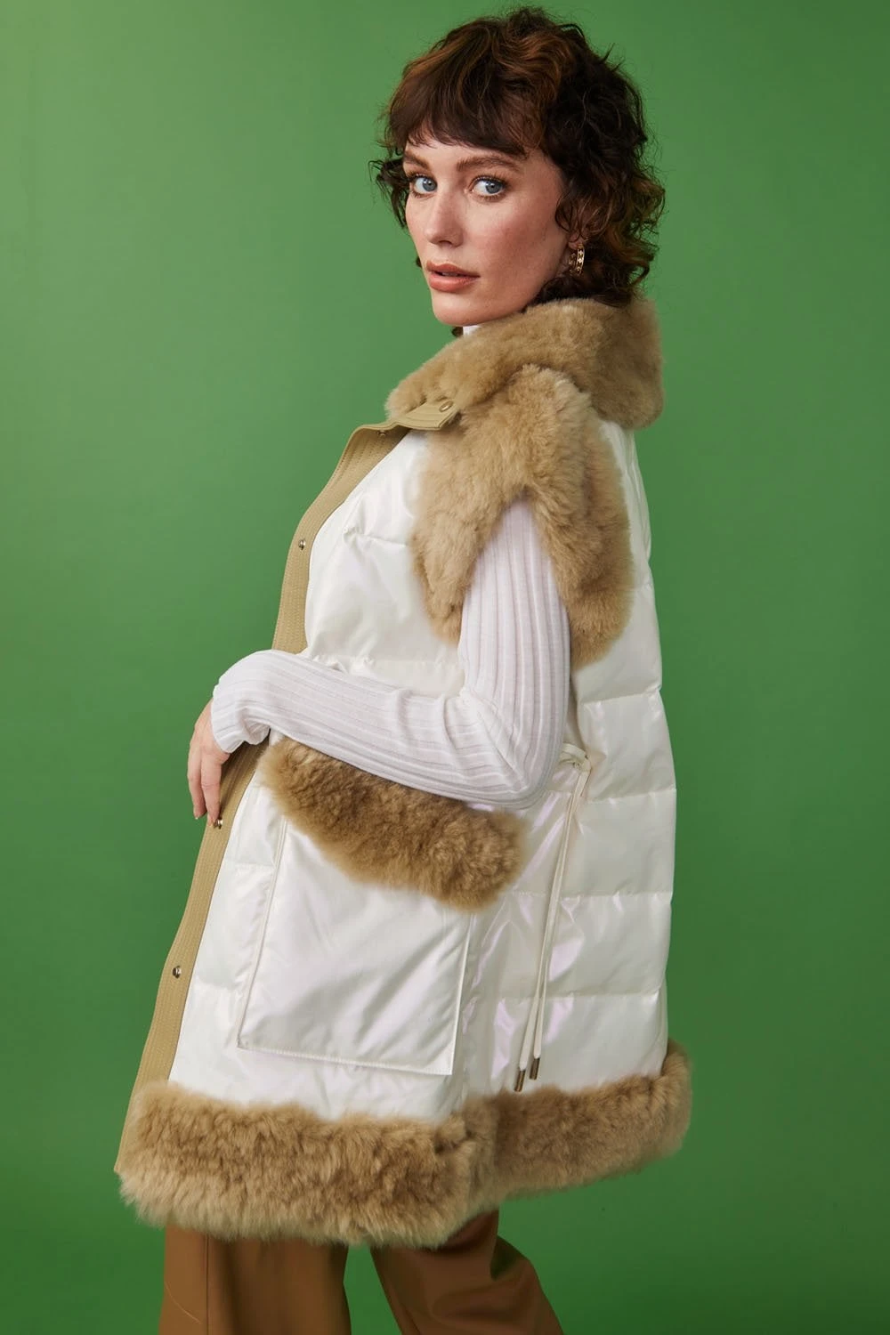 This oversized shearling gilet is guaranteed to keep you warm and cosy whilst you look super cool. The padded Duck Down body provides much needed warmth and the contrasting brown shearling collar and trim adds plenty of interest. The deep pockets and press stud closure makes it practical too.