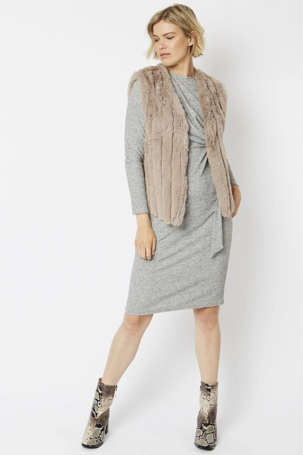 If you love to layer, then this faux fur and faux suede gilet is just what your collection needs. Featuring flattering vertical panneling, front hook and eye fastenings and a V-neck line.