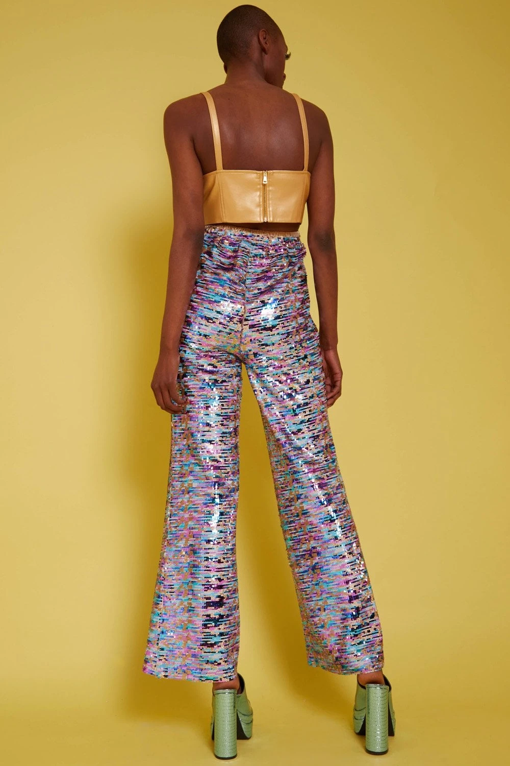 Our multi-Coloured velvety embellished crop top feature sequin geometric embroidery, silk lining, and zip Fastening. This outfit is deserving of a moment in the spotlight. Style with statement heels for a truly spectacular ensemble.