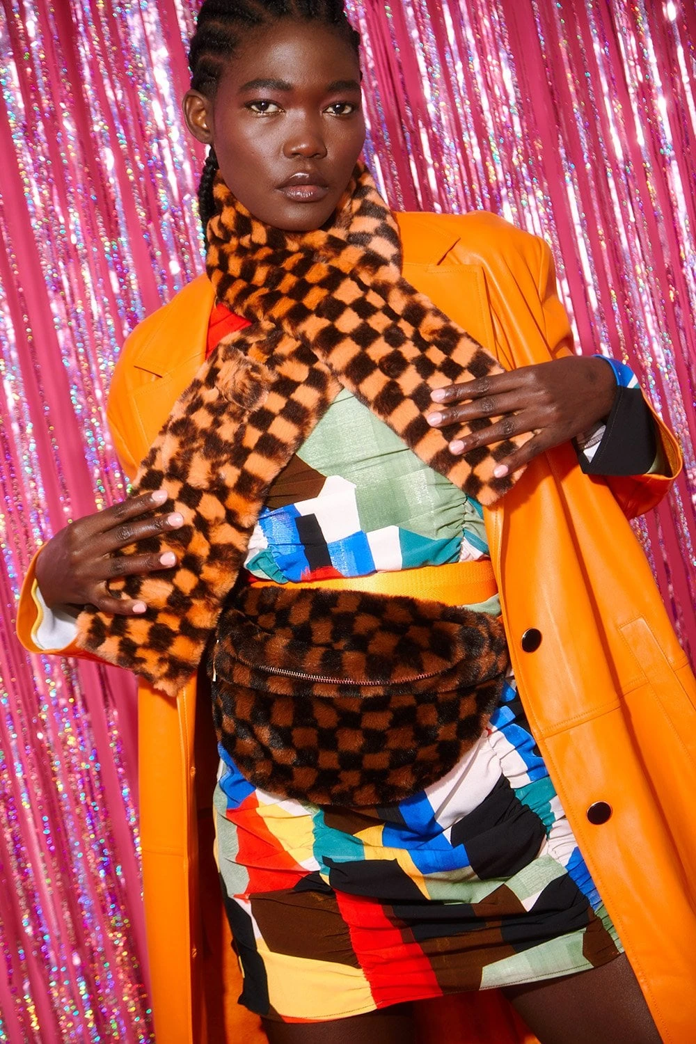 JAYLEY Orange And Black Checkered Faux Fur Scarf With Bow Detail Fastening