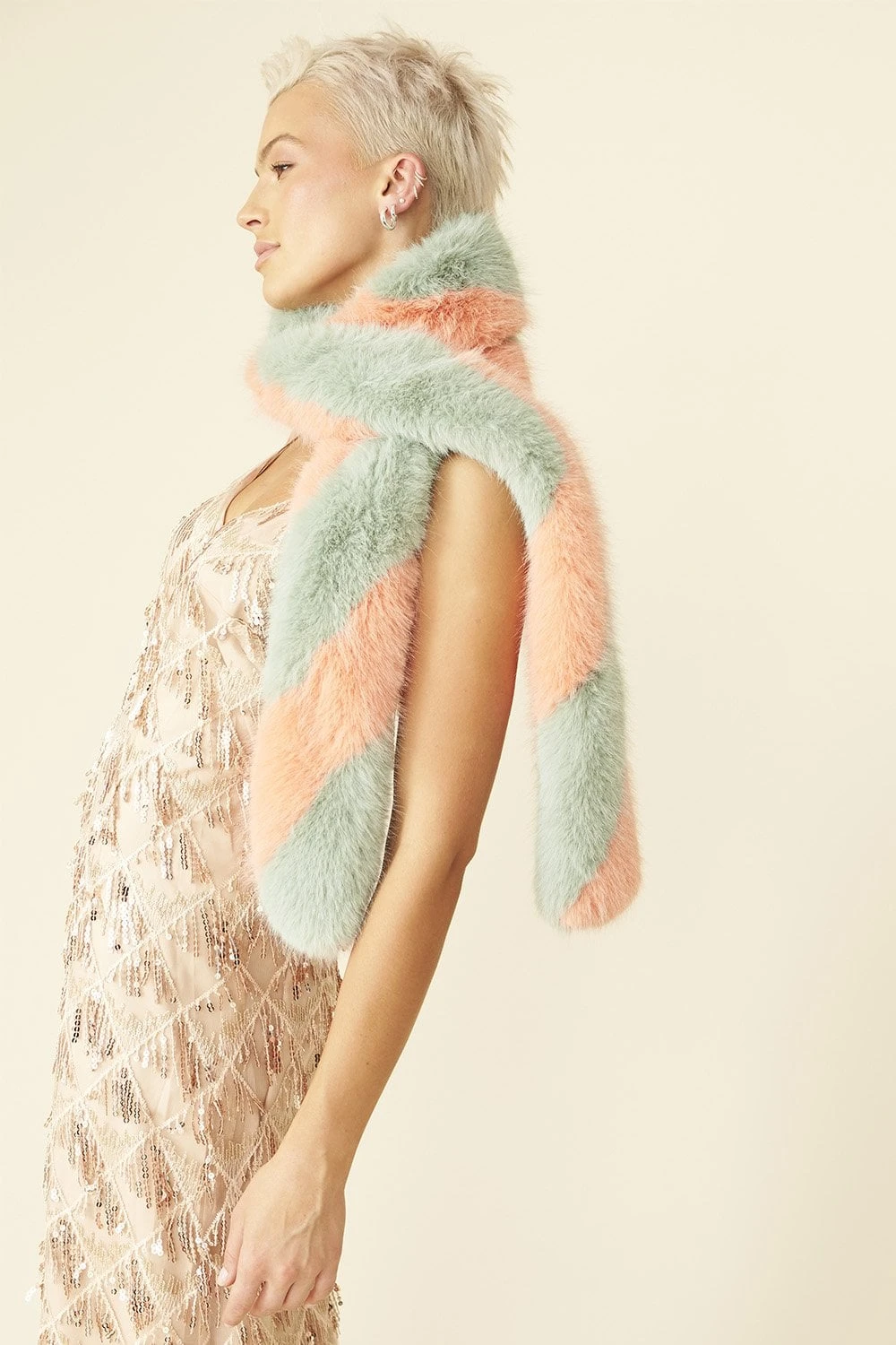 Snuggle up in luxury in this faux fur scarf. Perfect for adding a touch of colour to your look. This scarf can be fastened snuggly around your neck using the slit at the bottom of the scarf.