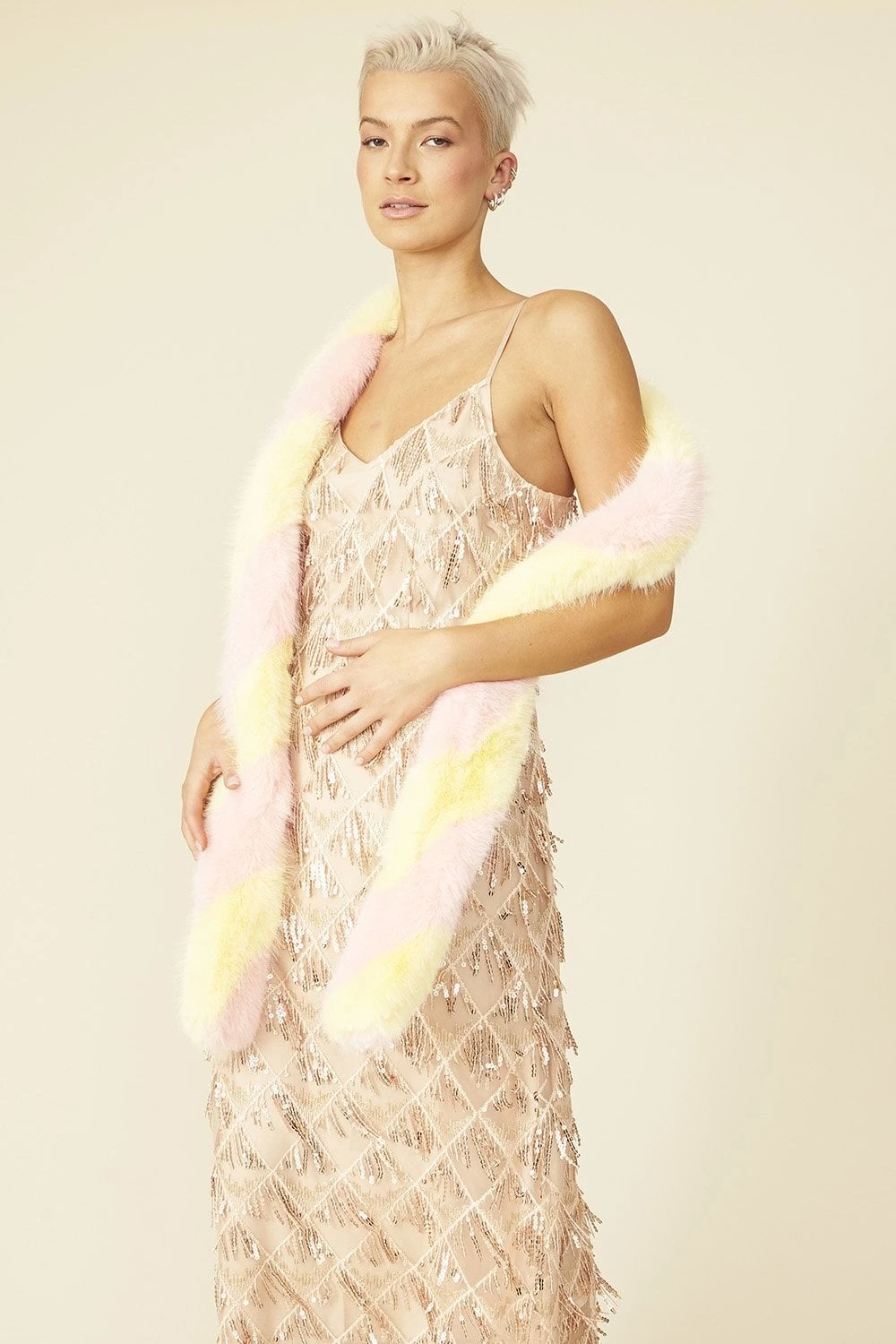 Snuggle up in luxury in this faux fur scarf. Perfect for adding a touch of colour to your look. This scarf can be fastened snuggly around your neck using the slit at the bottom of the scarf.
