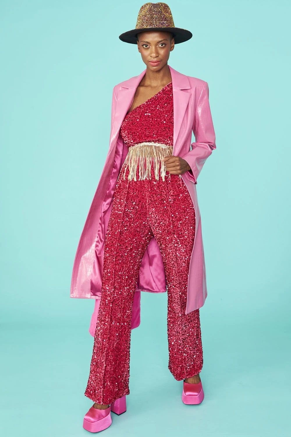 Pink-tone velvety embellished flared trousers featuring sequin embroidery, a high elasticated waist, silk lining and pockets.
