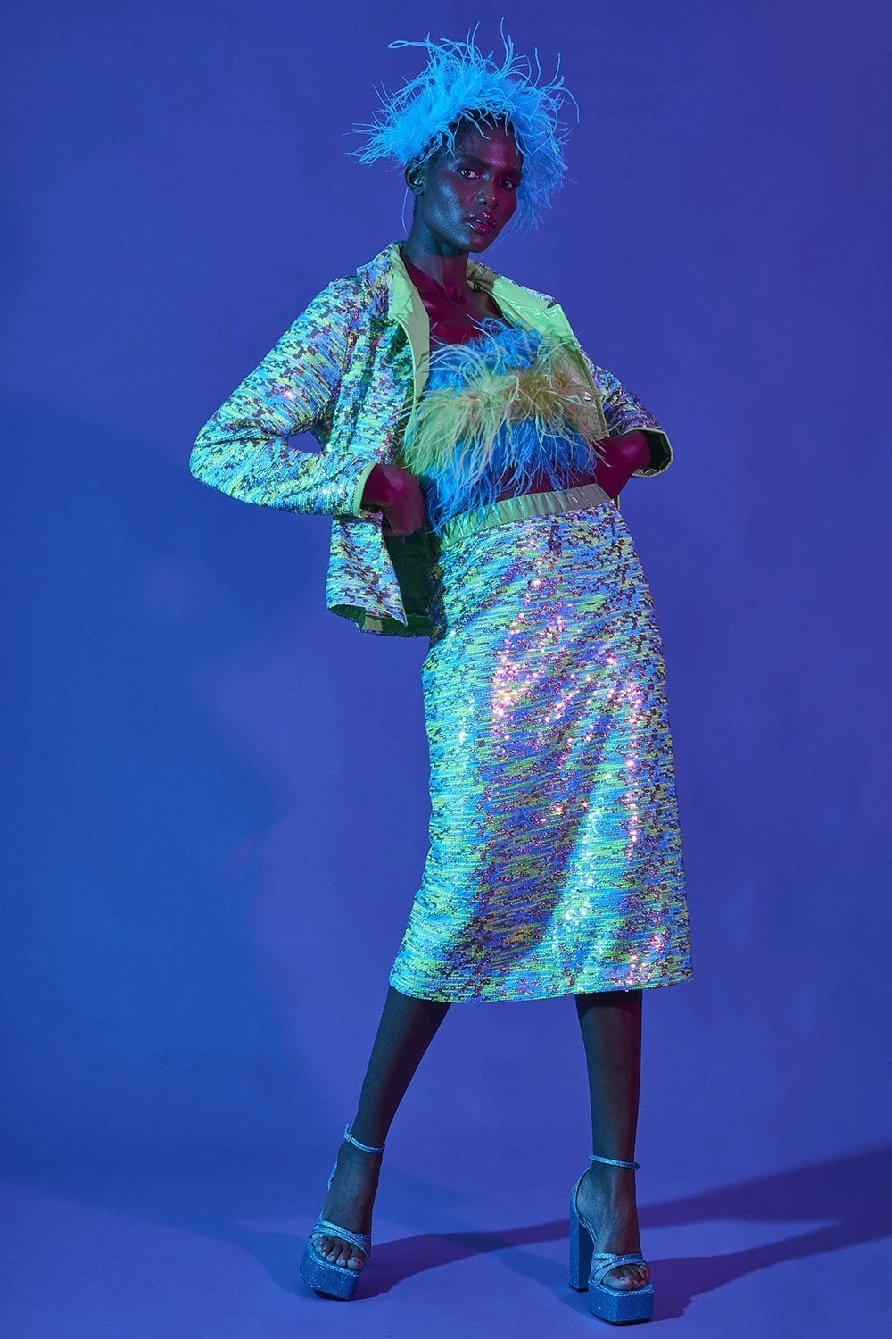 The brightest sequin skirt out there! This sequin skirt features a lime green eco-leather trim and satin lining.