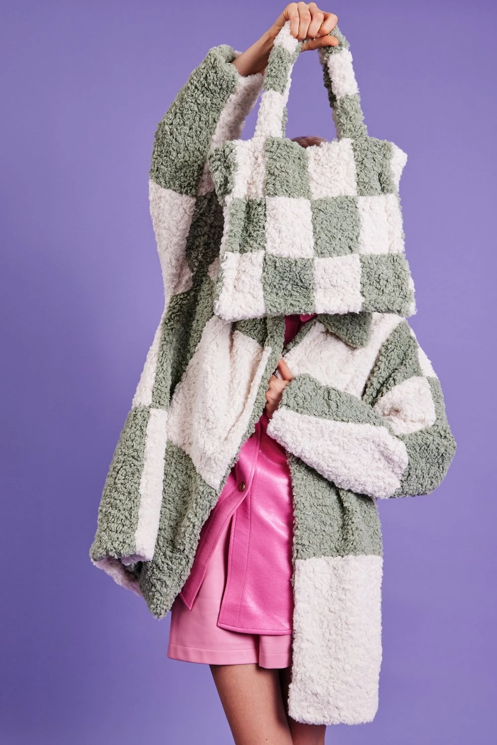 We LOVE these shearling checkered Tote bags featuring 2 grab handles, full lining and zip compartment. Style with our matching checkered coat for the full look!