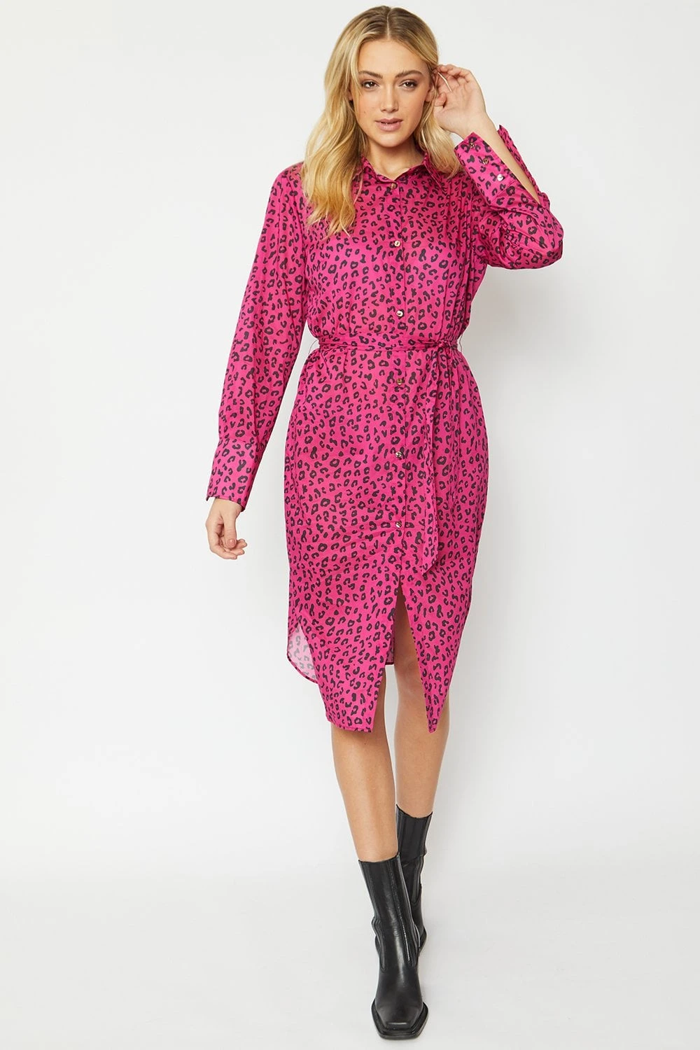 The perfect transitional piece, this feminine animal print button-down shirt dress is just what you need for transitioning into Summer This dress features a tie waist, frill hem, and full-length sleeves.