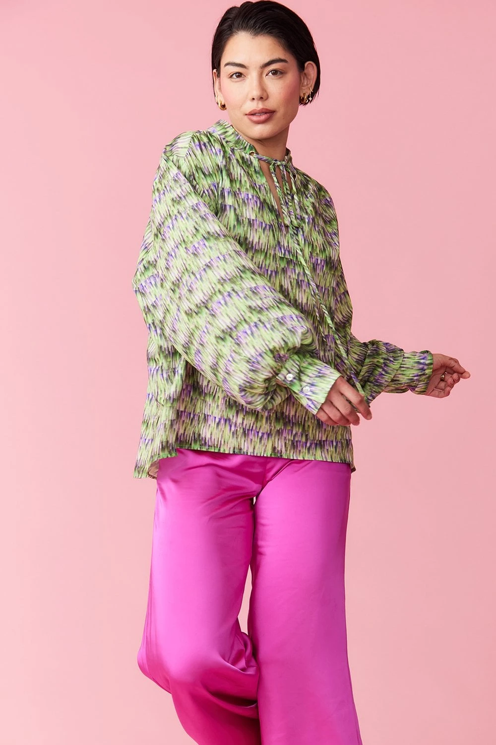 Stand out this summer with our gorgeous silk blend lace neckline blouse! It features an abstract print, lace-up neck detail and full-length sleeves. This blouse is perfect for any occasion!