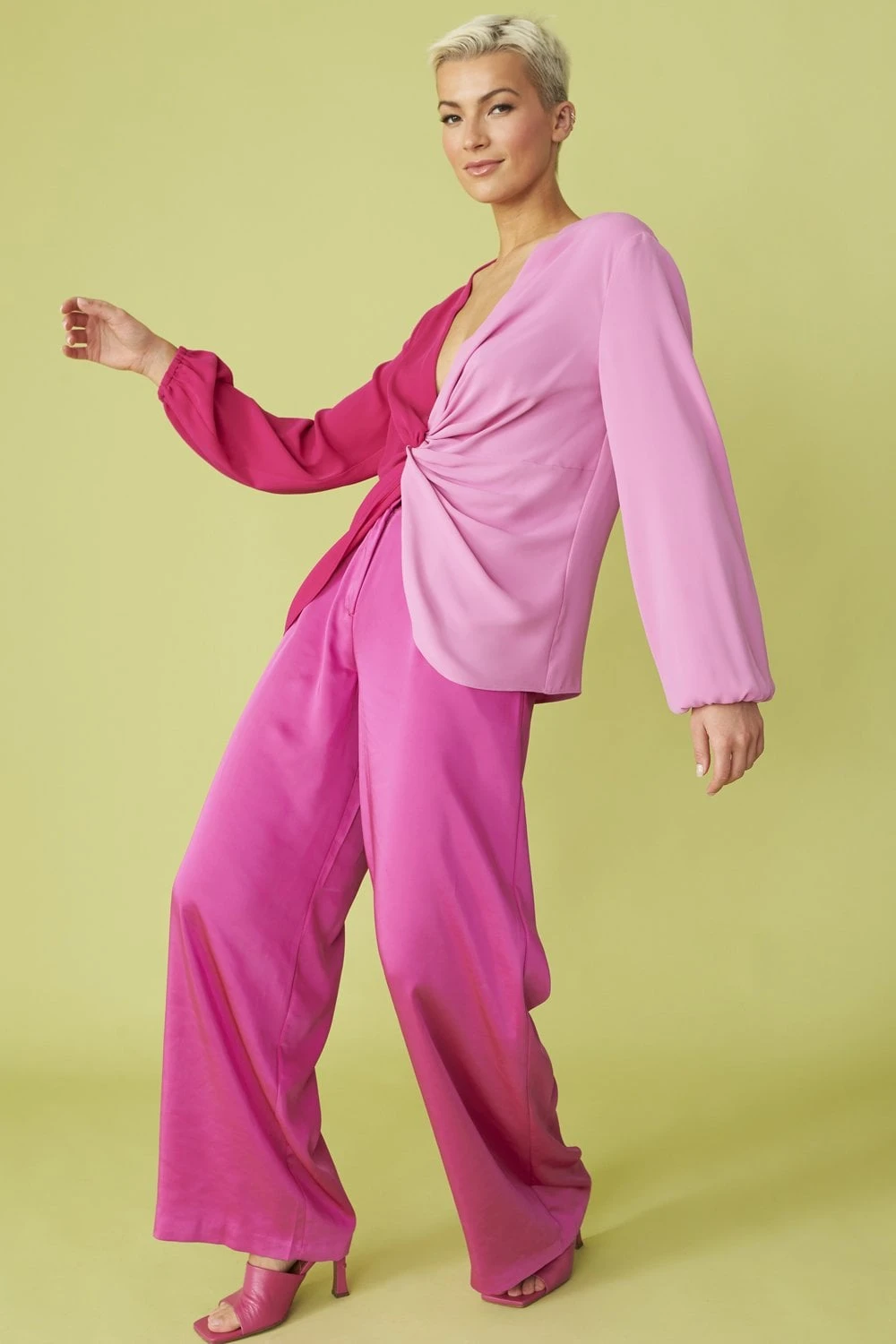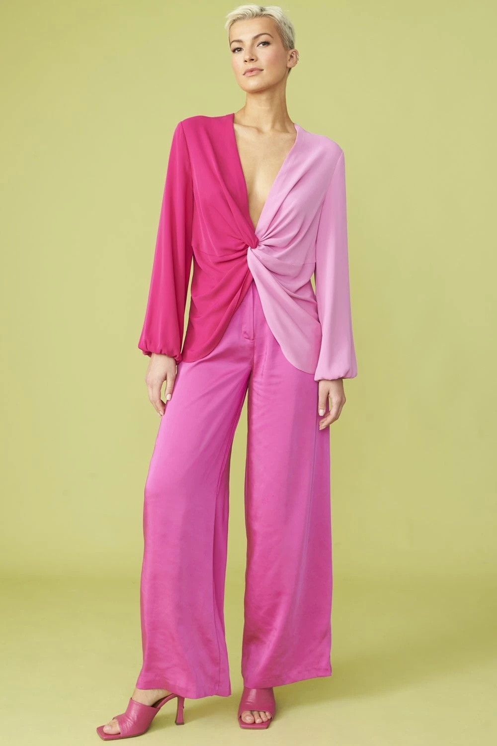 This gorgeous pink colour block blouse from our latest collection is the perfect addition. With a twist knot detailing and silk blend finish, the team with jeans and heels for that glam look this season.