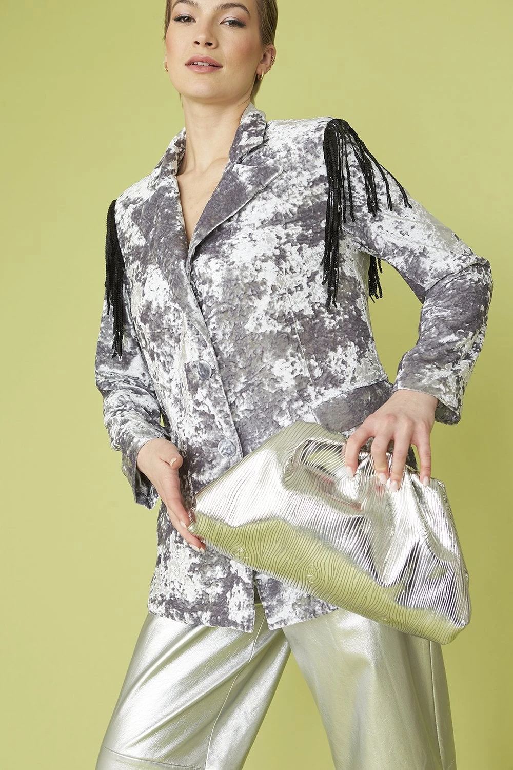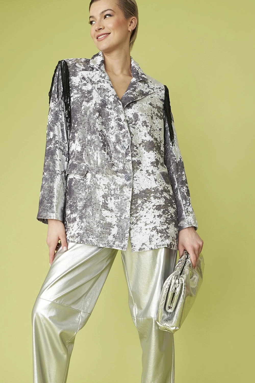 Upgrade your blazer collection with our gorgeous crushed velvet double-breasted blazer with black tassel shoulder detail. this blazer features, pockets, silk lining and padded shoulders.