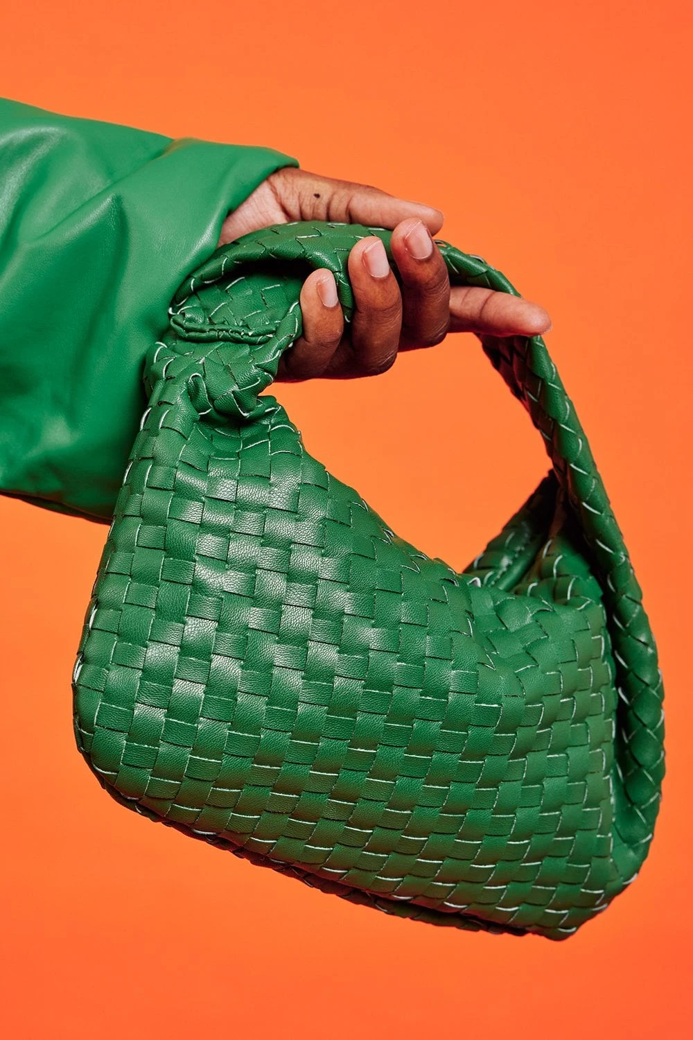 Rounded hobo bag in woven by hand with a curved, seamless structure and soft, voluminous shape with signature knot detail on the handle.