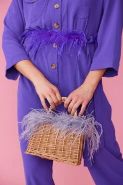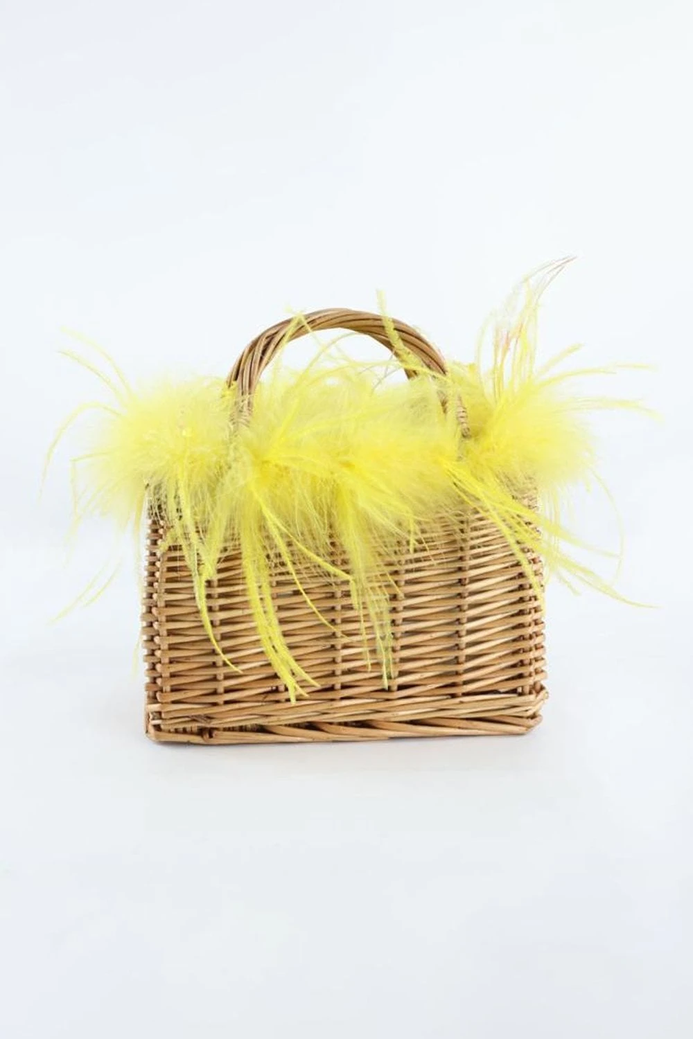 Ostrich feather straw bucket bag. Designed from a classic straw weave, this smart structured bag from Jayley offers style and versatility. Featuring ostrich feather and silk lining this bag is a stand-out must-have piece.